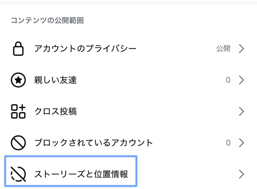 - コンテンツの公開範囲から「ストーリーズと位置情報」を選択