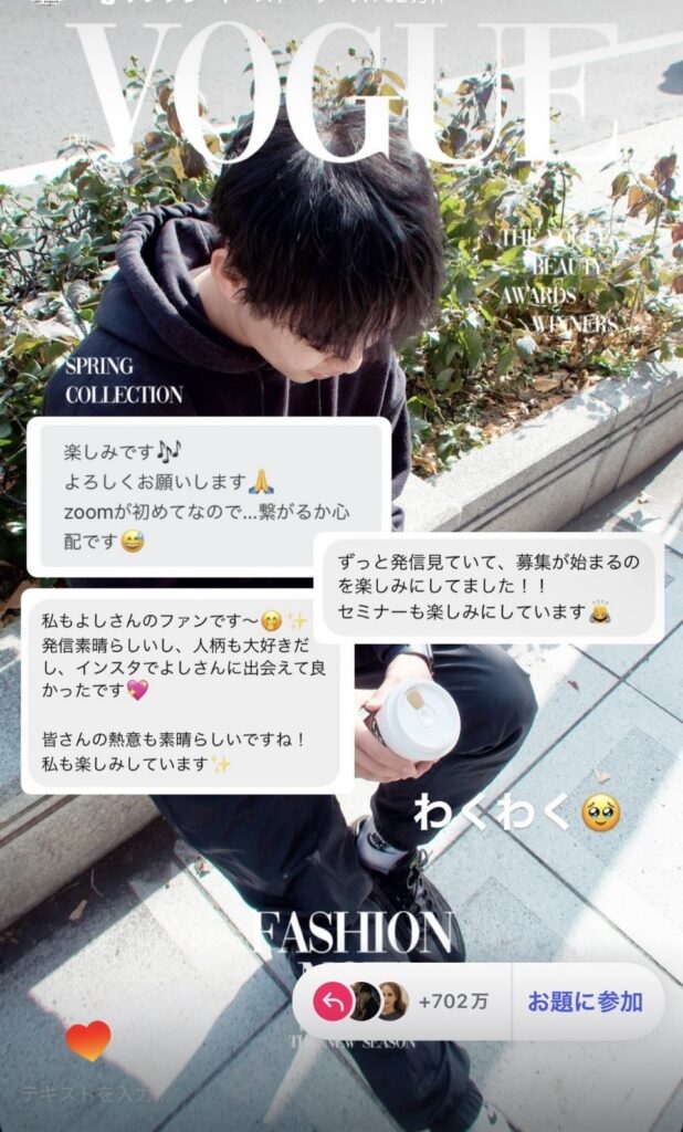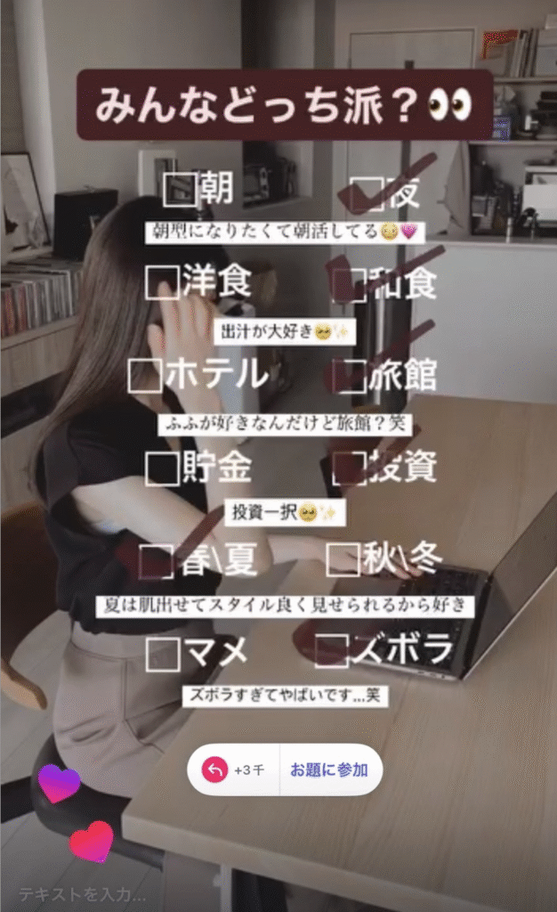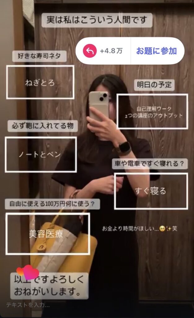 お題のような機能を使えば、コミュニケーションを取る場が生まれフォロワーとの親密度がグッと上がるでしょう。